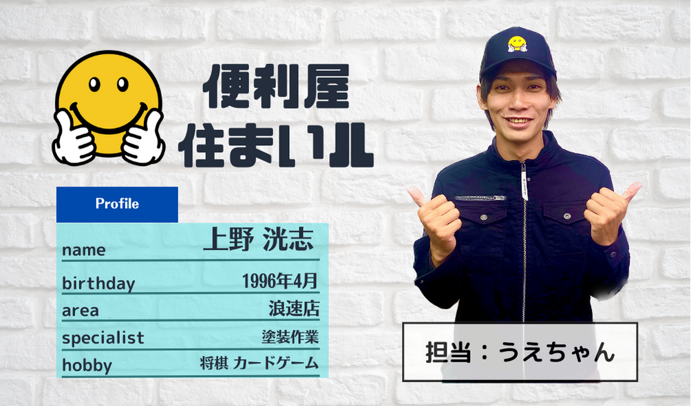 イケメン担当のうえちゃん!オールラウンダーでどんな事でも解決します。特に塗装や丁寧な荷物運が得意です。